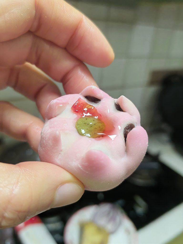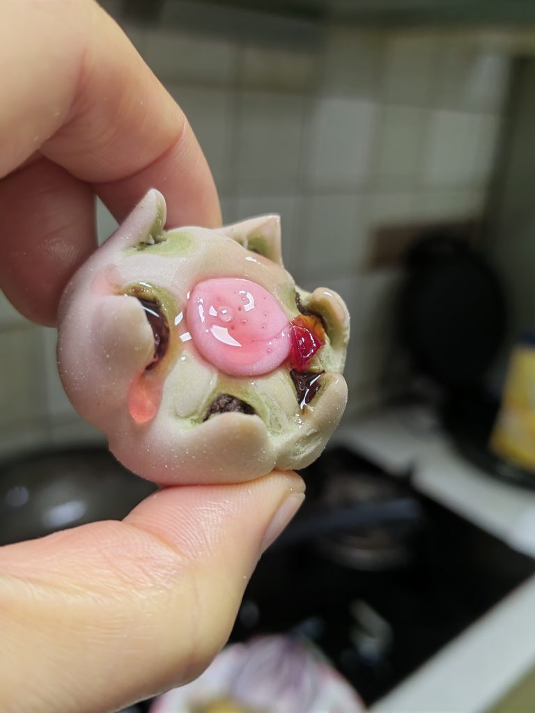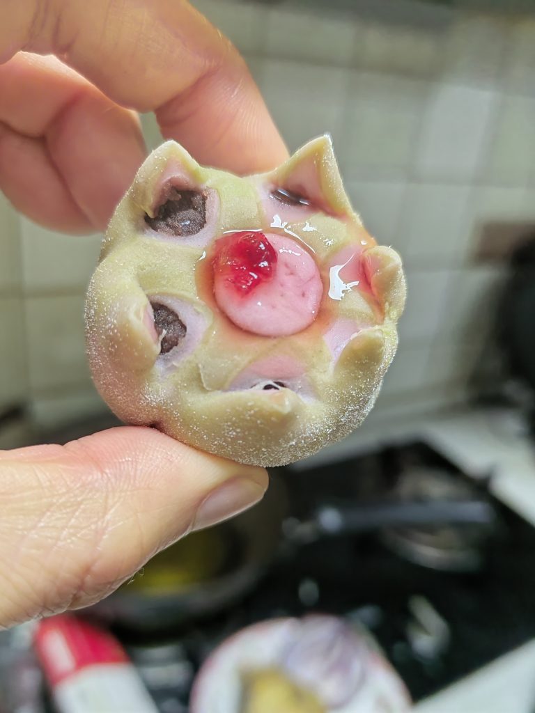 The petals are spread out like “lotus emerging from water”, with a crispy and sweet texture. It is filled with coconut paste and red bean paste.